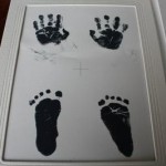まったく女の子らしい顔つきではないが、はじめてのひな祭りということで、うちにある唯一のひな祭り道具の立雛を枕元において、写真をパチリ。 それから、寝ている隙を見計らって、妻の実家からいただいたもので手形・足形をとってみた。 丸まっている手を無理やり広げたので、かなりぶれた。 比べたことはないが、デカイ方なのでは・・・