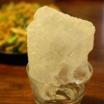 一度溶かしてしまった氷を冷凍庫に戻して、砕いても残ってしまった塊がこいつです。 芋焼酎を入れましたが、氷の先っぽしか焼酎に入りません。 飲みにくさは格別な上に、焼酎をストレートで飲むような感じになりました。 氷がいい感じに溶けるまで、結構長い時間悪戦苦闘で楽しめました。